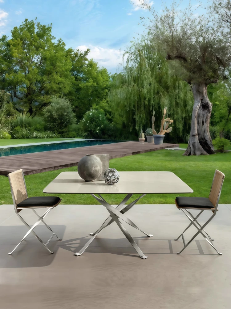 クリエイティブな屋外・屋内兼用コンビネーションテーブルセット!輸入の大理石テーブルと北欧ミニマルデザインのラタンチェアで、テラスやガーデン、別荘にぴったり。スタイリッシュな空間を演出しませんか?