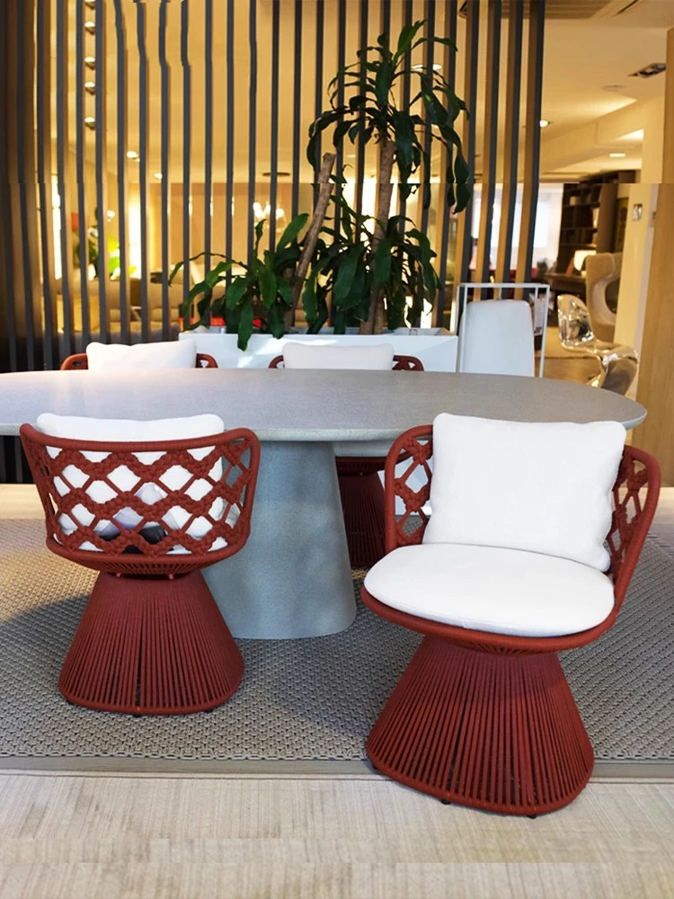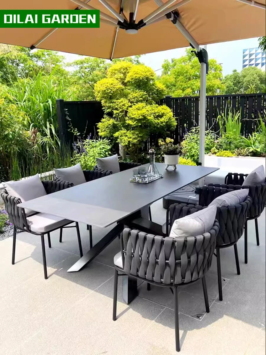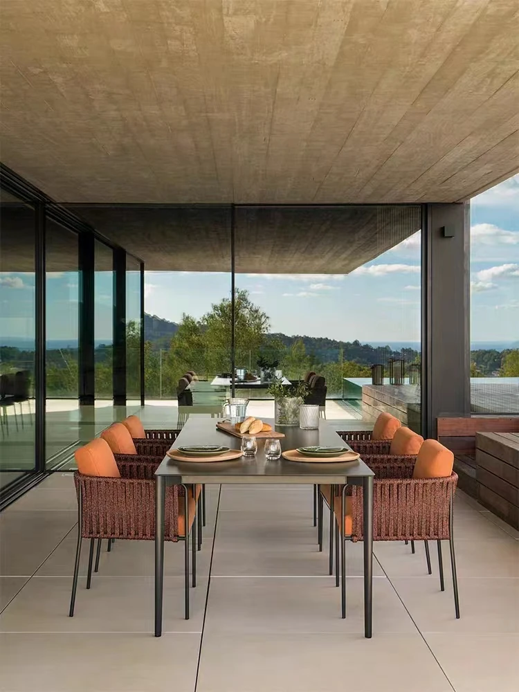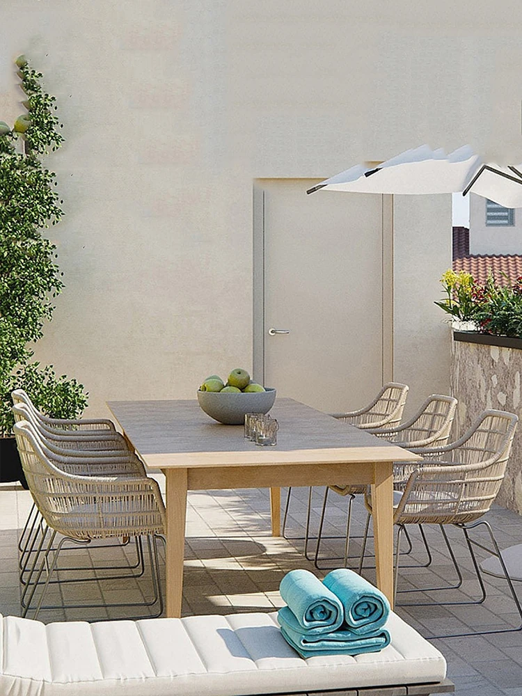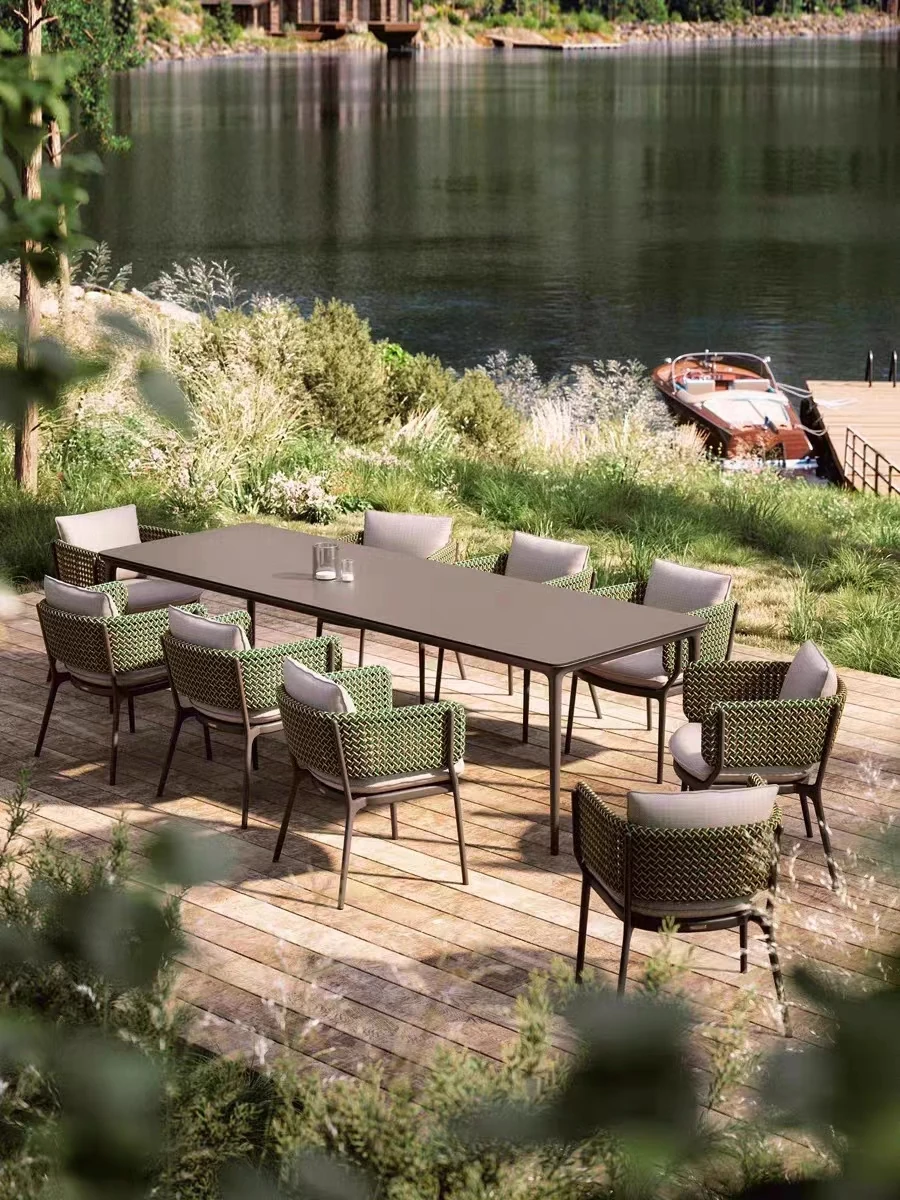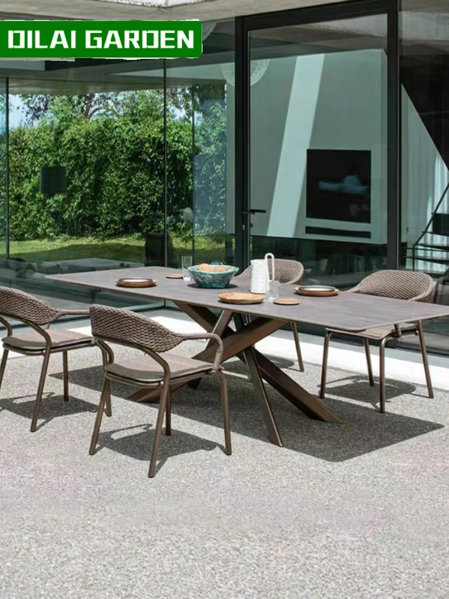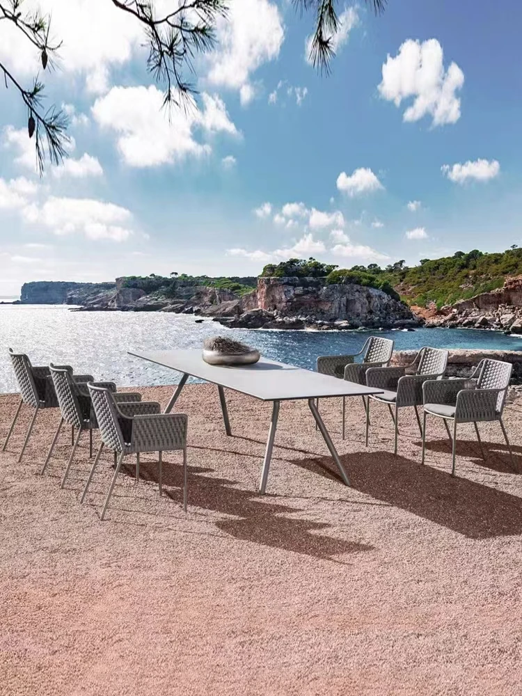 高級別荘向け屋外庭園テーブル&チェアセット!リラックスできる藤製の椅子と耐水・耐候性のある岩板ダイニングテーブルで、快適なバルコニーライフを楽しもう。おしゃれで機能的な家具で、あなただけの特別な空間を演出します!