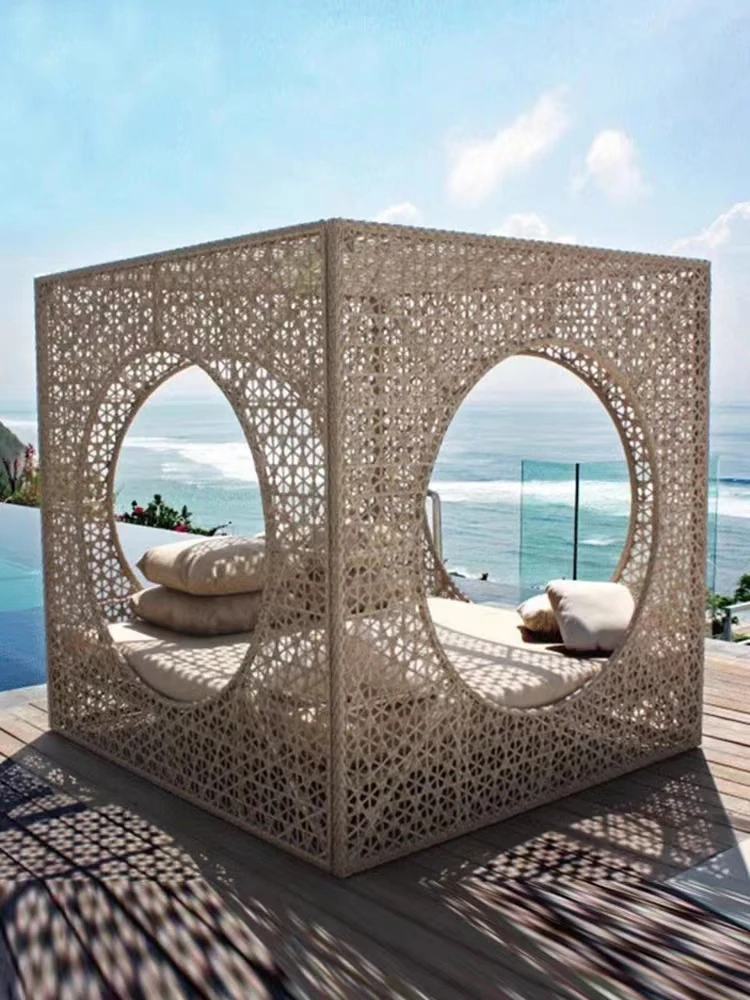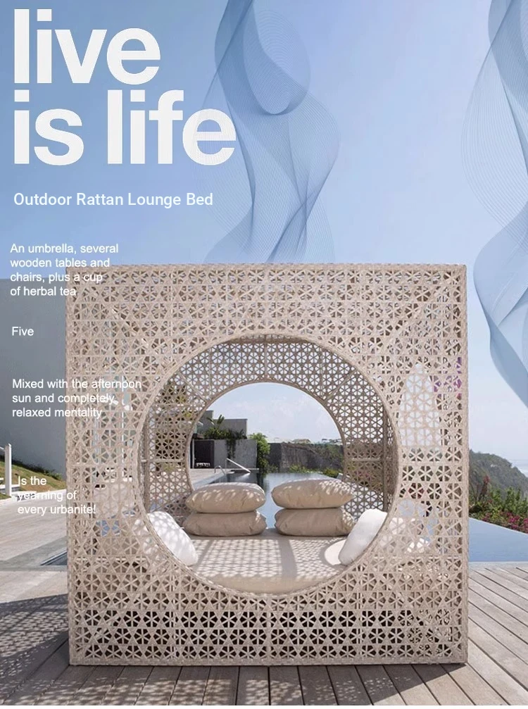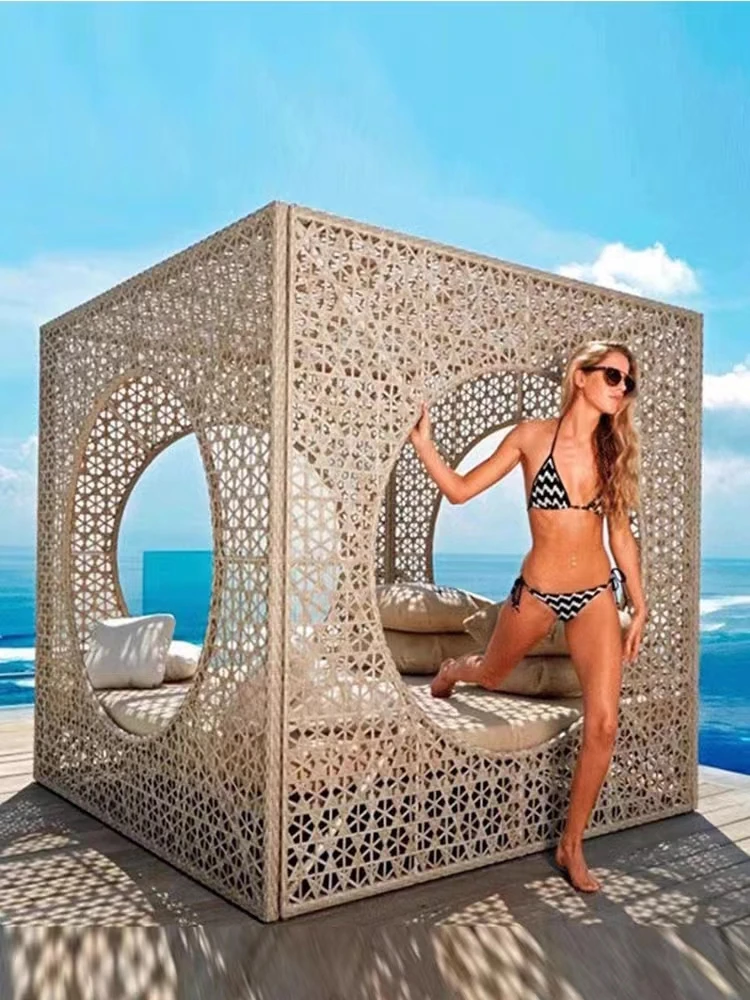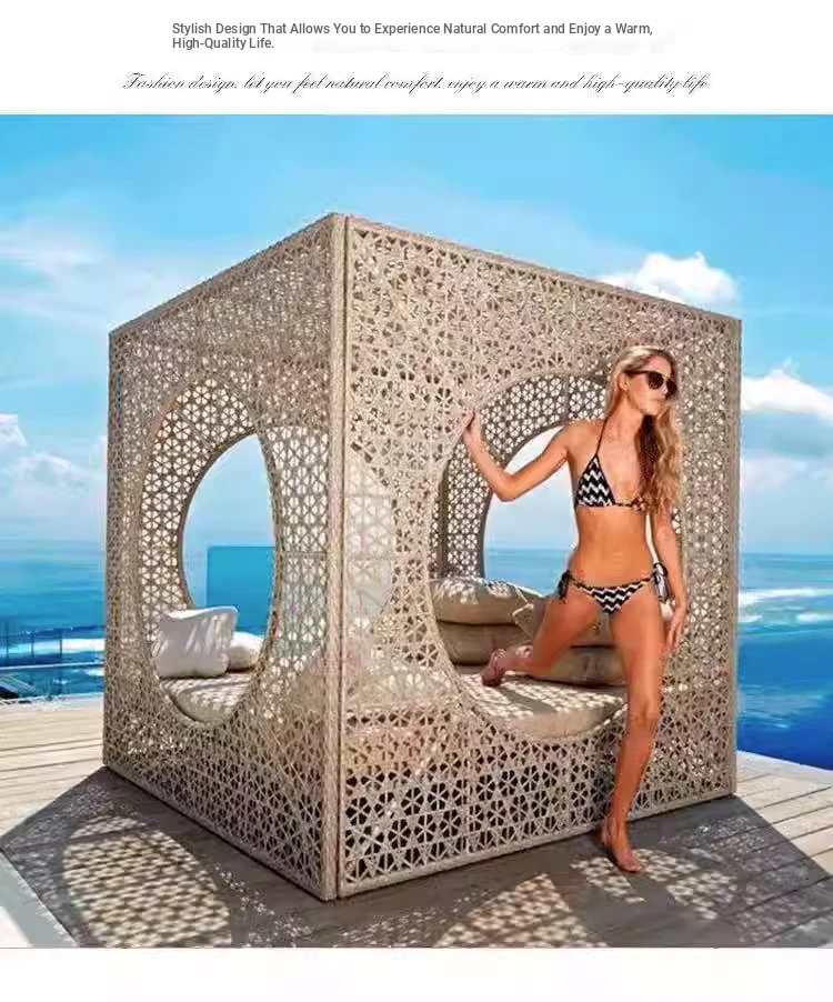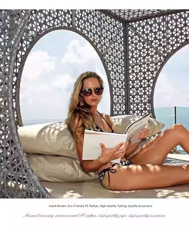 北欧スタイルのアウトドアラウンジベッド - プールサイドやバルコニーに最適な藤編みソファ!リラックスできる鳥の巣のようなデザインで、庭やビーチにぴったりのテラス家具です。