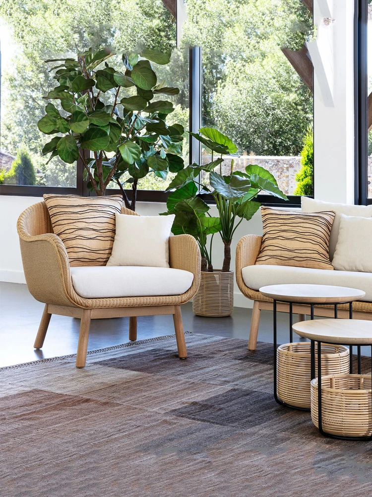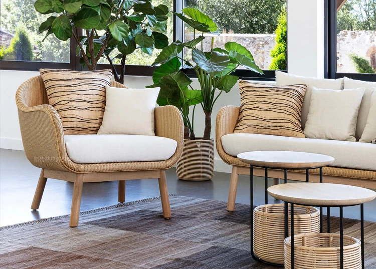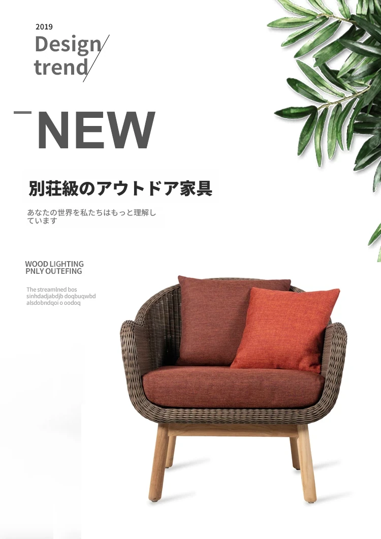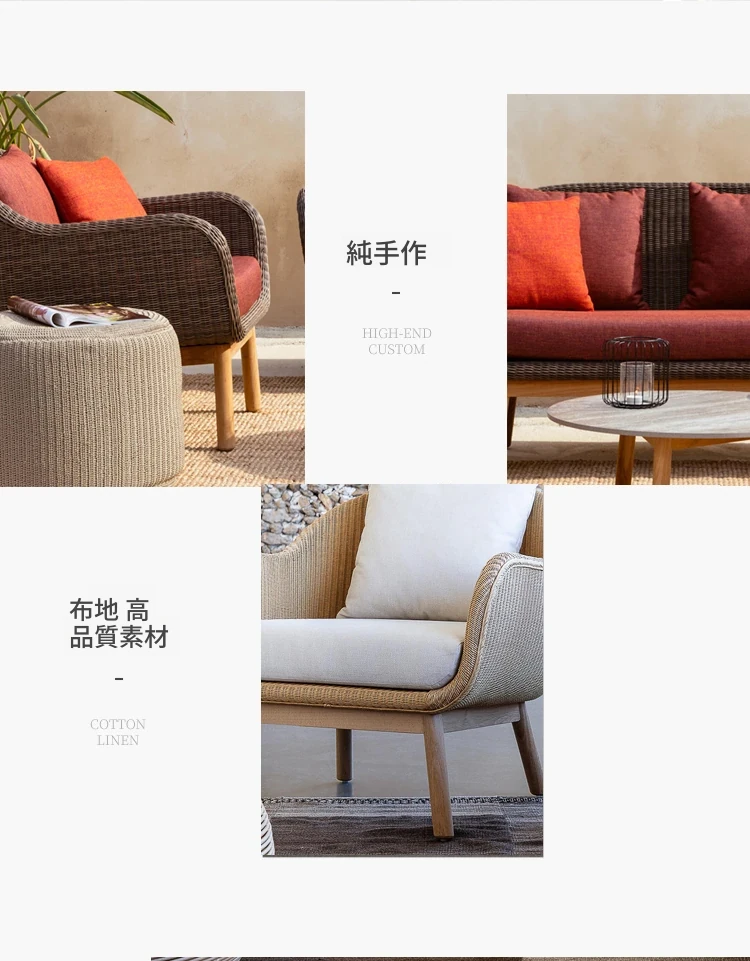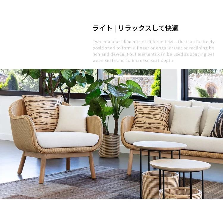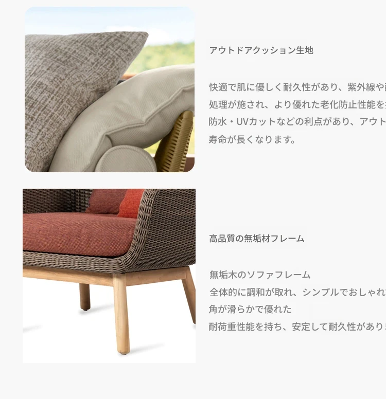 アウトドア用天然木とラタン製のソファセット - シンプルでスタイリッシュな庭やバルコニーに最適!リラックスできる空間を演出するテーブルとチェアのコンビネーション。ヴィラやガーデンにぴったりの家具です!