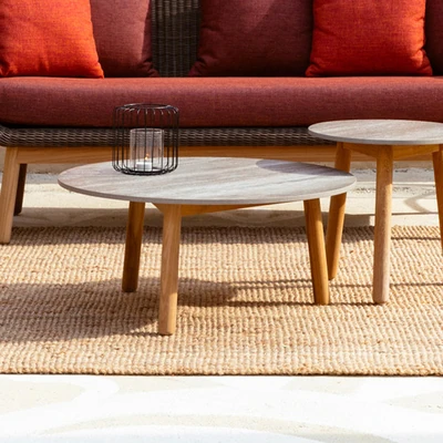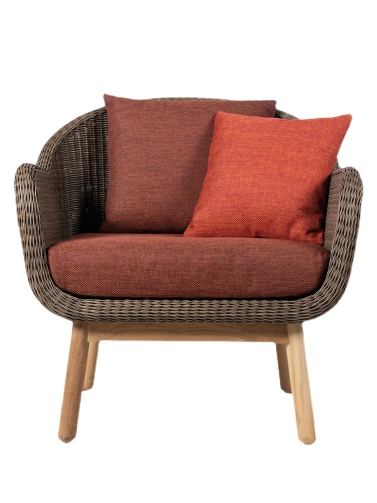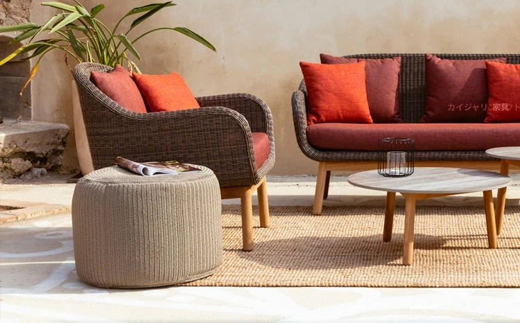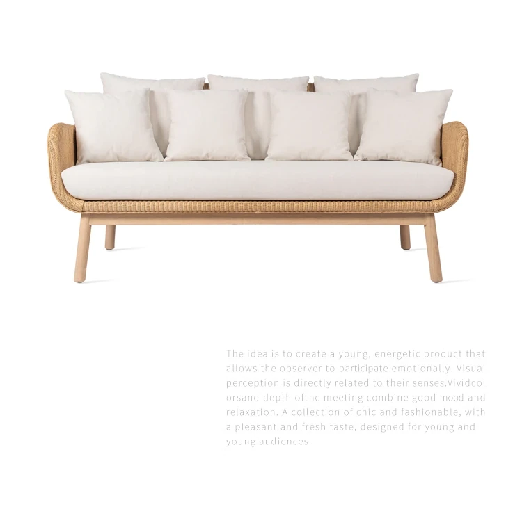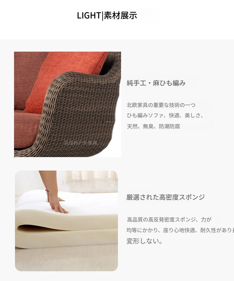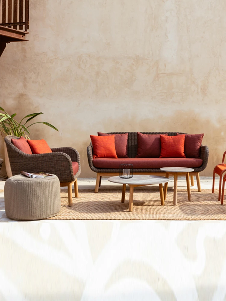 アウトドア用天然木とラタン製のソファセット - シンプルでスタイリッシュな庭やバルコニーに最適!リラックスできる空間を演出するテーブルとチェアのコンビネーション。ヴィラやガーデンにぴったりの家具です!