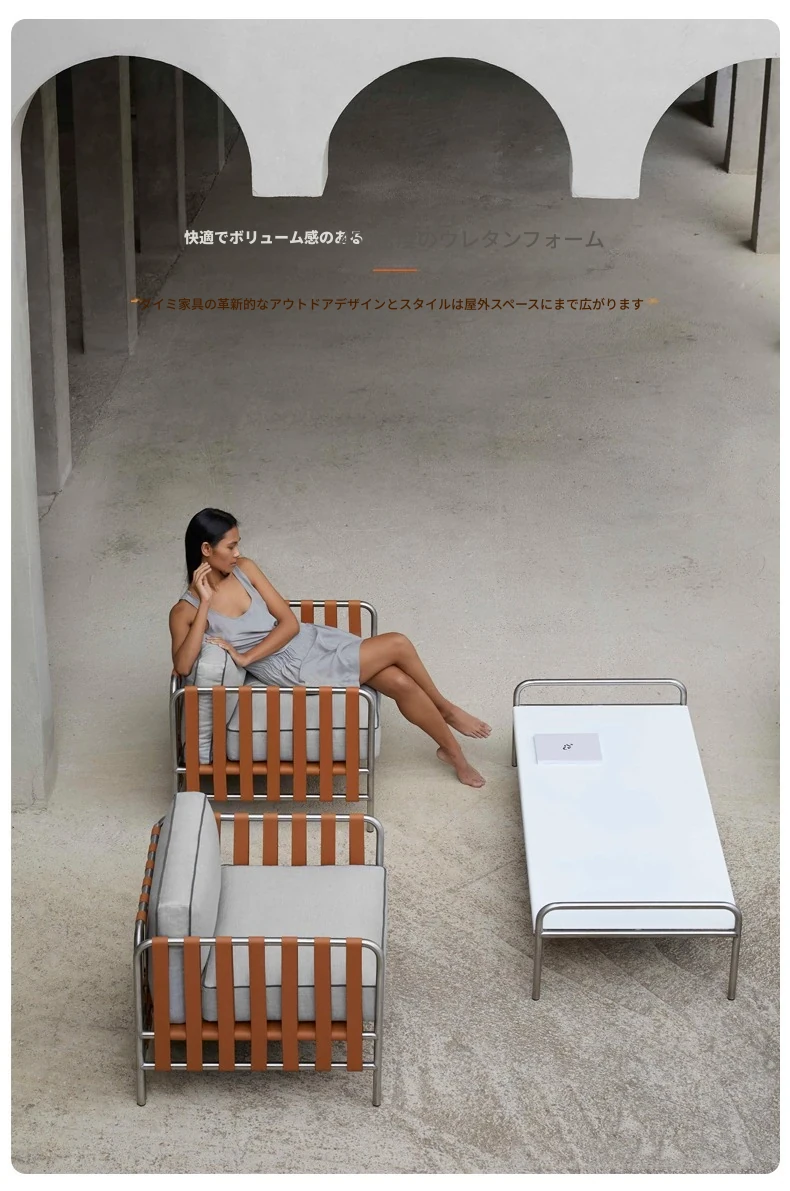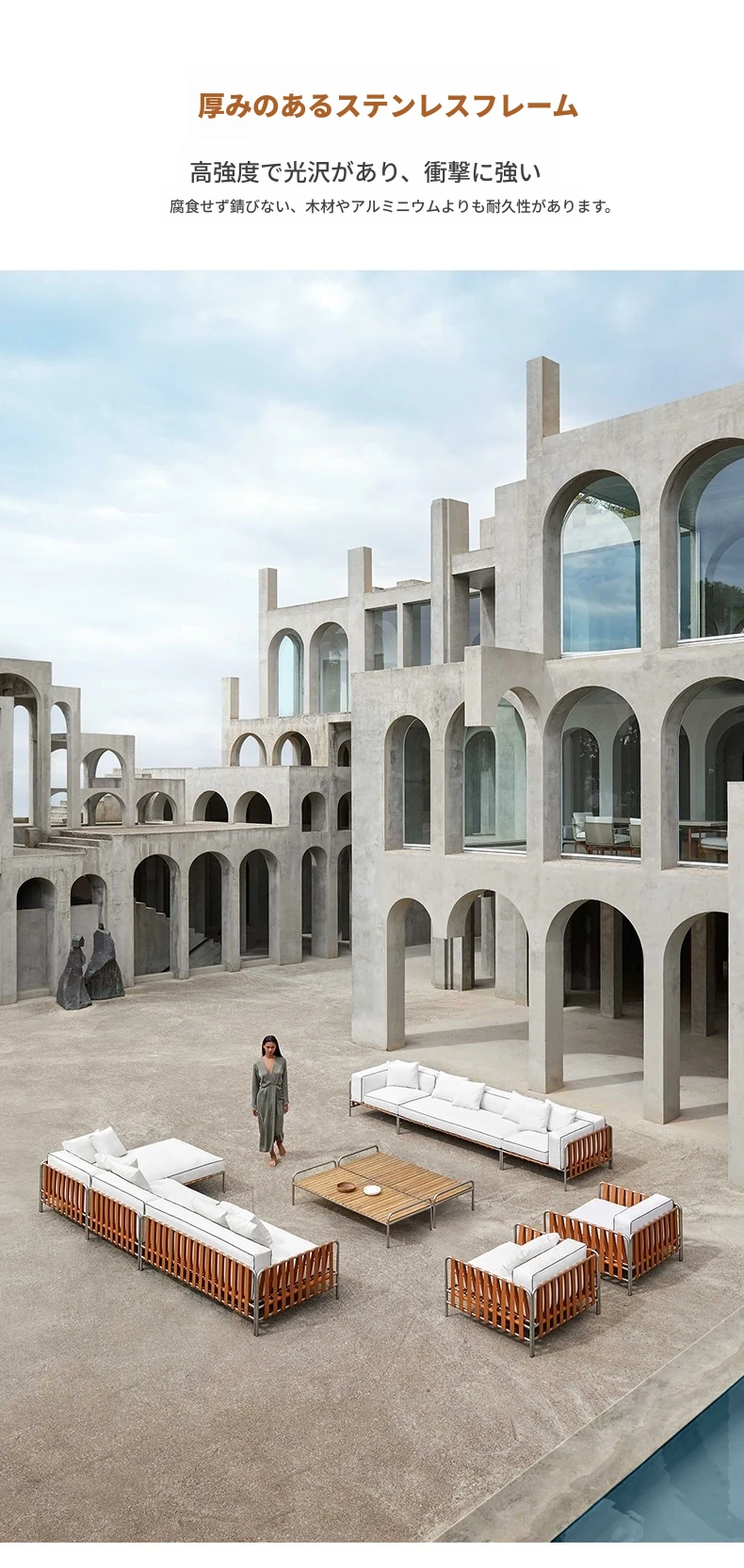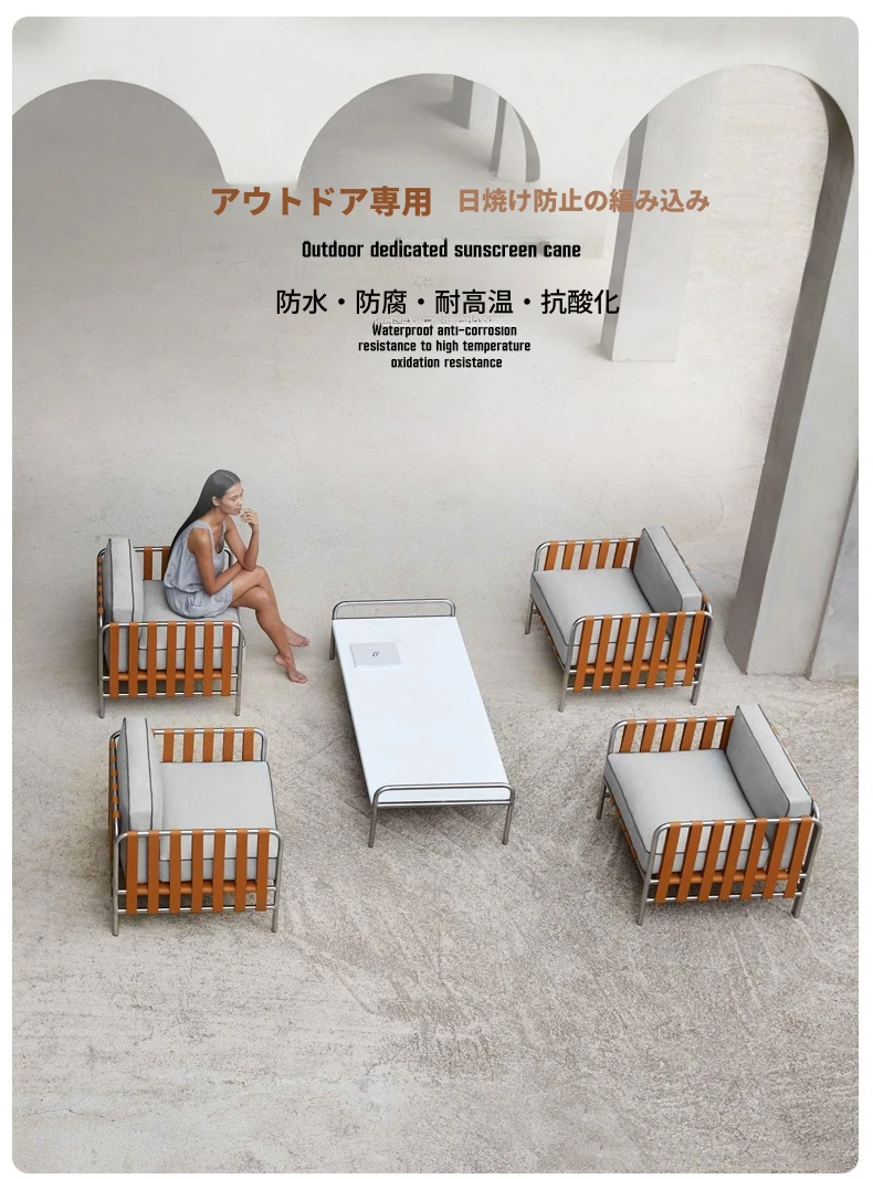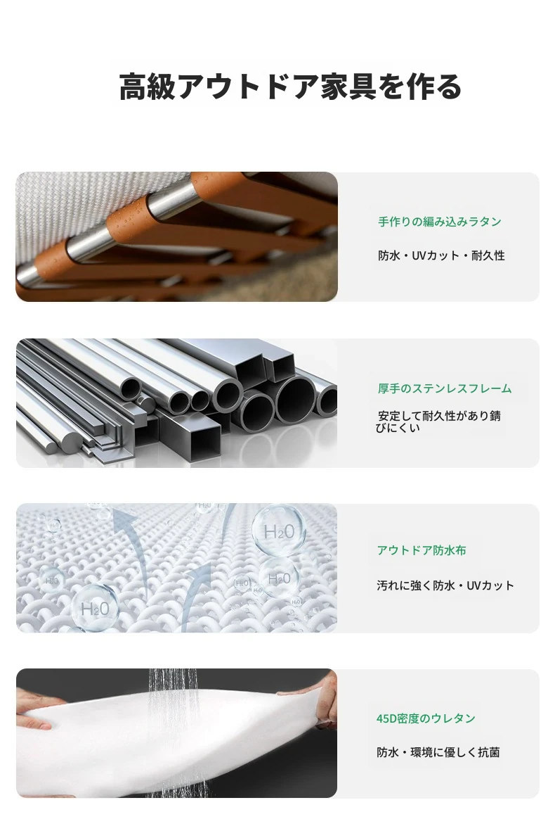 アウトドア防水・UVカットステンレス製ヴィラ風ラタンソファセット!シンプルでスタイリッシュな庭やバルコニーにぴったりの家具、テーブルとソファのコンビネーションで、快適なリラックスタイムをお楽しみください!