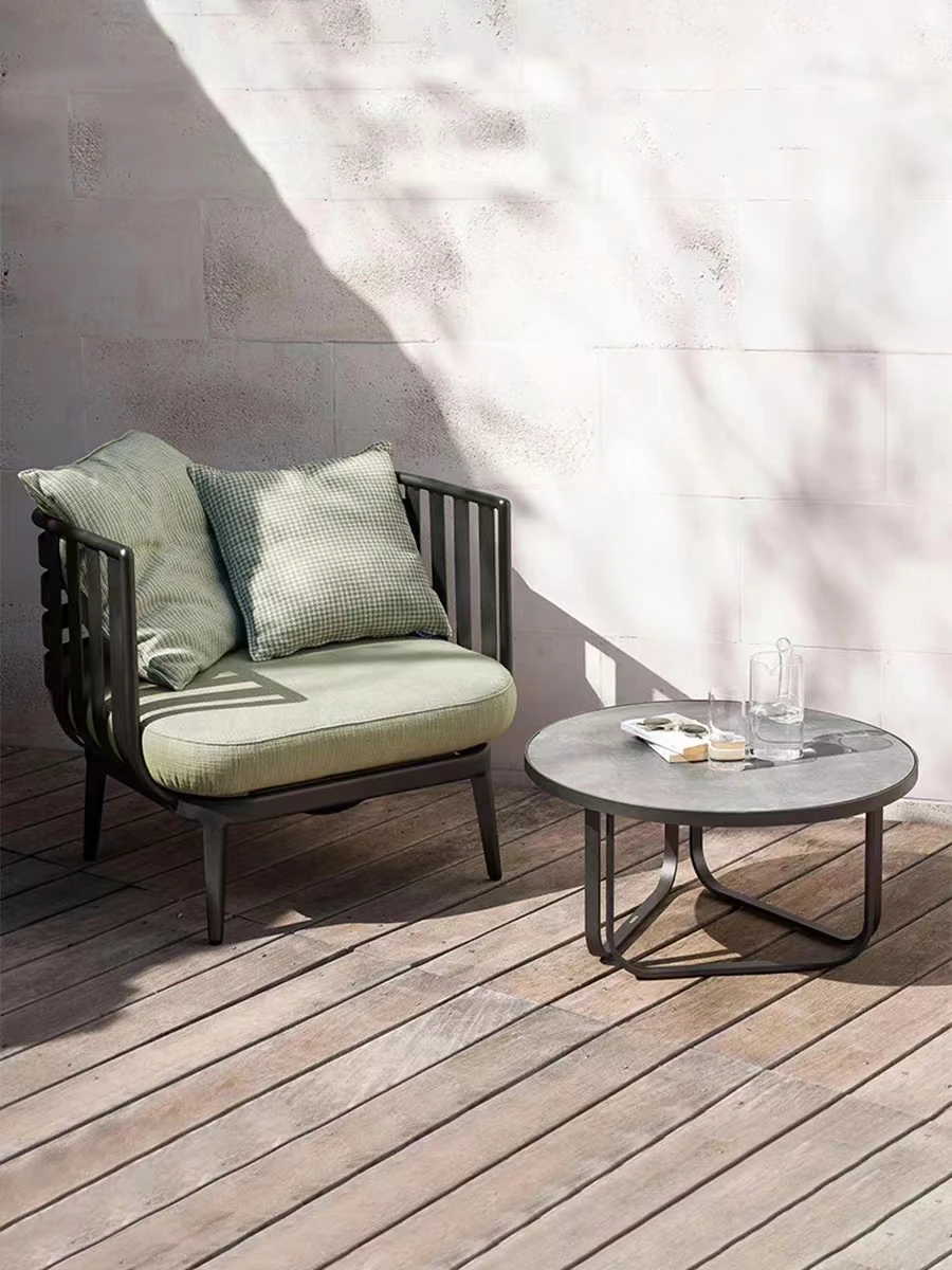 新中式デザインのアウトドアソファ!シンプルなラタンチェアとアルミニウム合金製、雨にも強いバルコニーや庭にぴったりなラタン編みのガーデンテーブル付き。快適でスタイリッシュな屋外空間を実現!