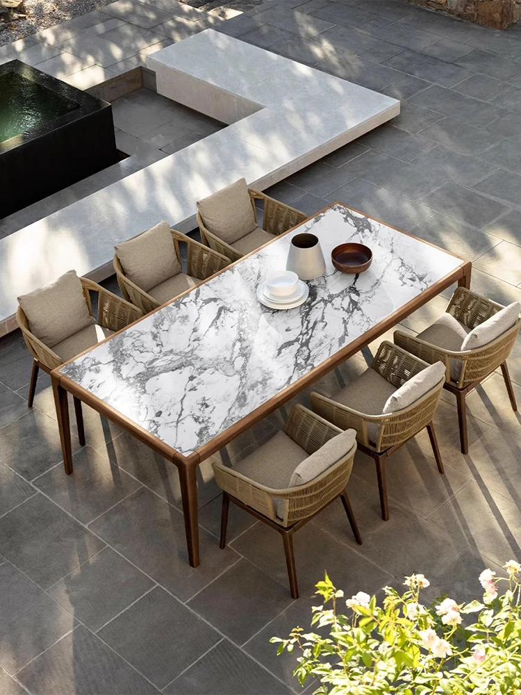 マスター設計のアウトドアテーブル&チェアセット!雨や日差しに強いステンレス製、大理石のダイニングテーブル。おしゃれなリビングや庭、別荘にぴったりの組み合わせ!快適なひとときをお楽しみください。