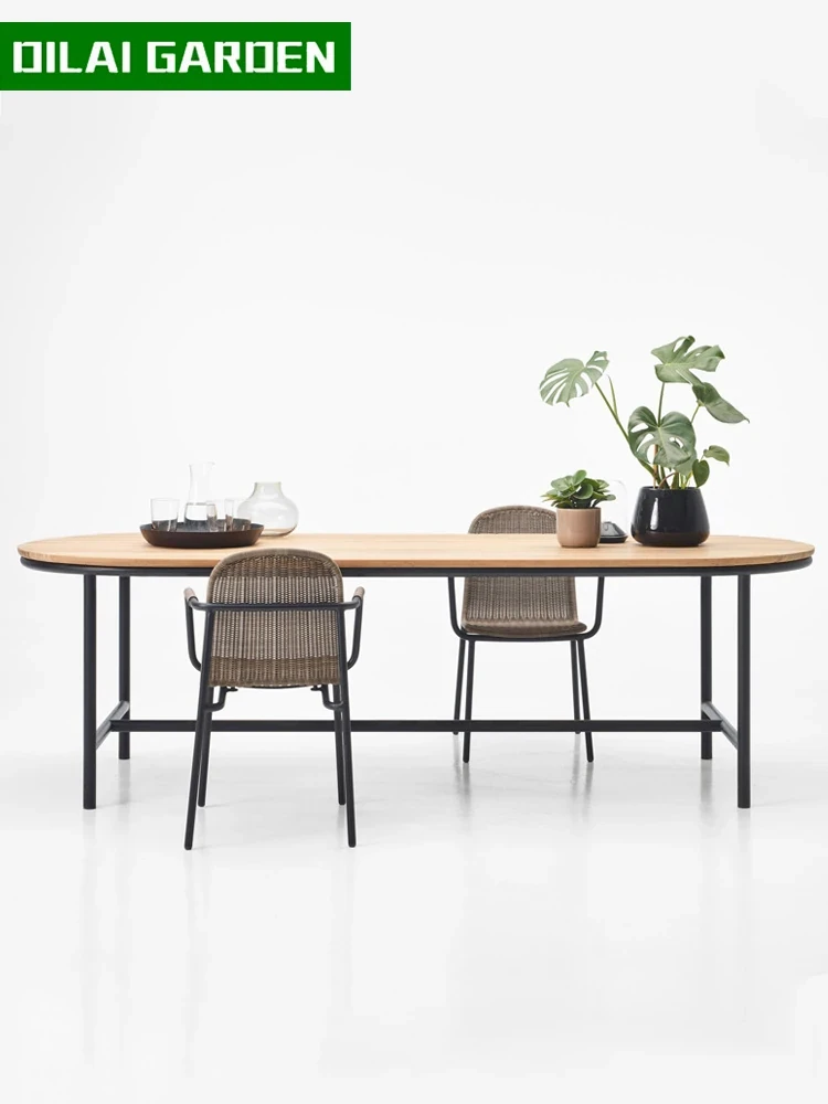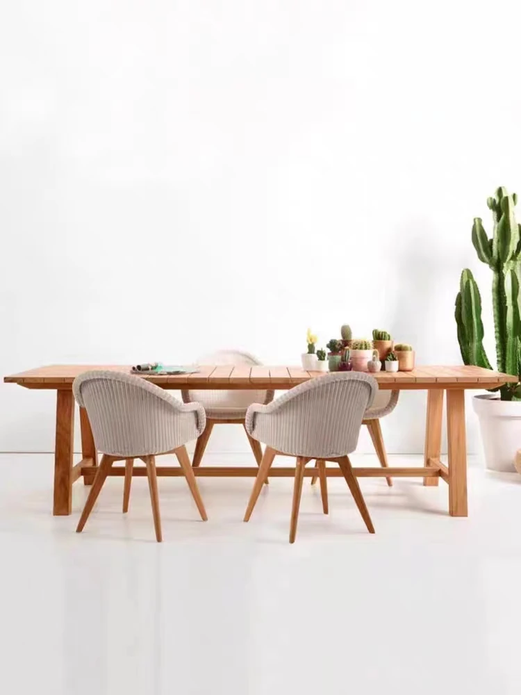 アウトドアテーブル&チェアセット - ヴィラや庭にぴったり!耐水・耐候性のチーク材使用、スタイリッシュなラタンチェア付き。リラックスできるバルコニーやテラスでのくつろぎの時間をお楽しみください!