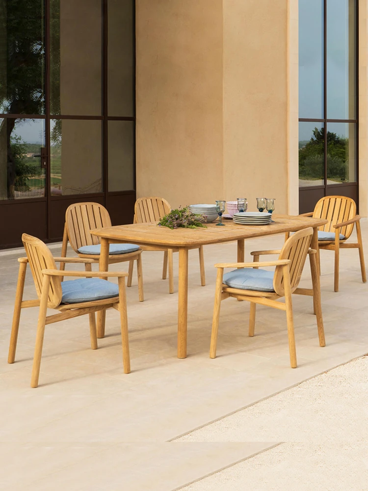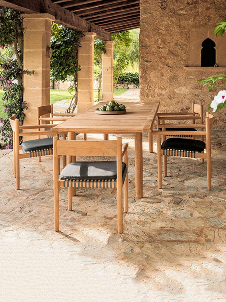 高級チーク材のアウトドアテーブル&チェアセット - 庭やテラスにぴったりな実木製の四角いダイニングテーブルとラタン製リラックスチェアで、心地よいひとときをお楽しみください!
