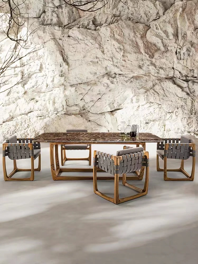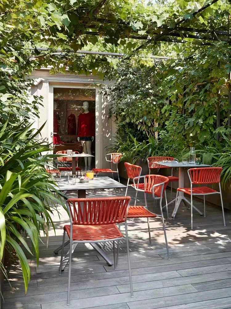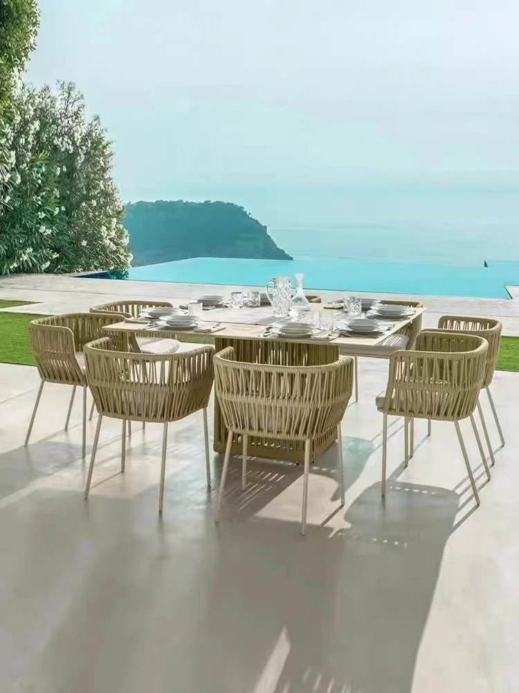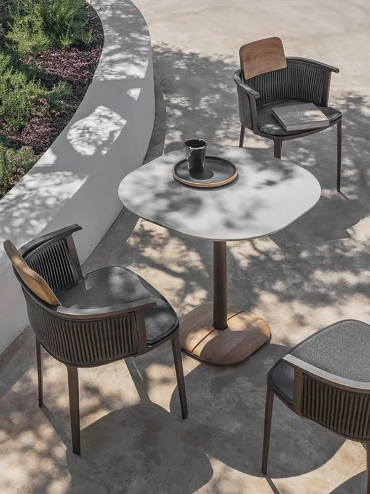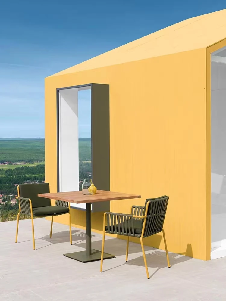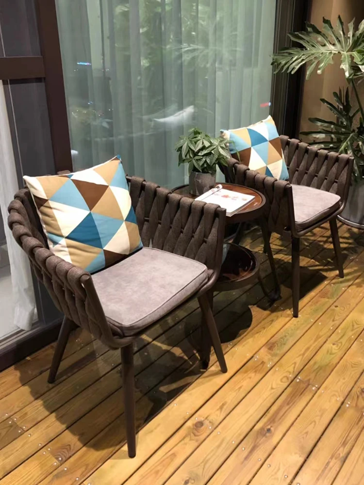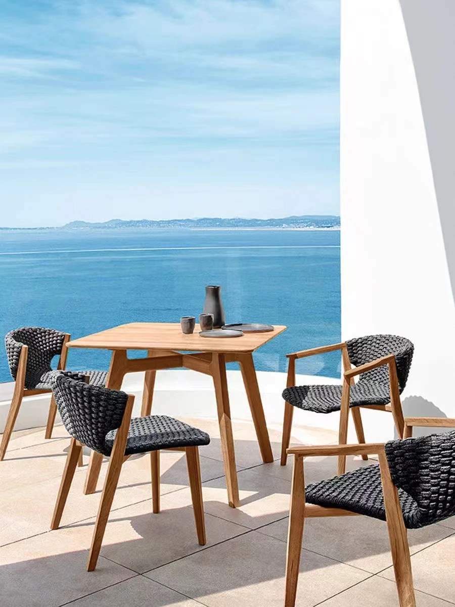 北欧スタイルのアウトドアテーブル&チェアセット - 防腐木製!創造的なバルコニー用ラタンチェア、別荘や庭に最適なリラックス空間を提供。カフェにもぴったりなロープ編み椅子で、スタイリッシュなひとときをお楽しみください。