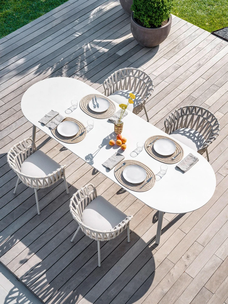 日差しの中で楽しむ!アウトドア用の本格的な北欧スタイルのラタン編みテーブルセット。別荘や庭にピッタリの高品質な実木ダイニングテーブル。リラックスできるガーデンテラスのための理想的な家具です!