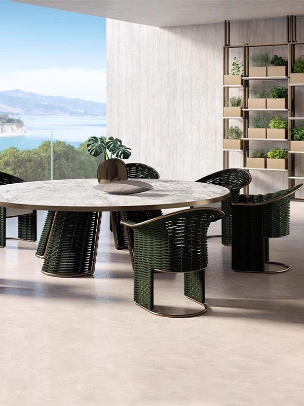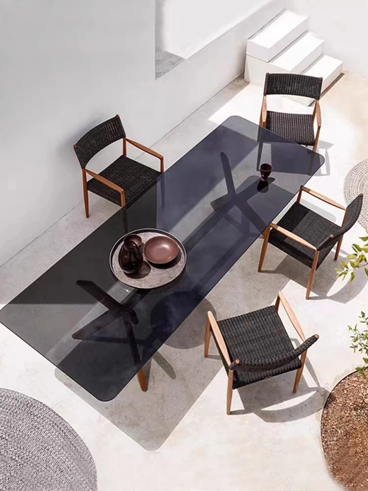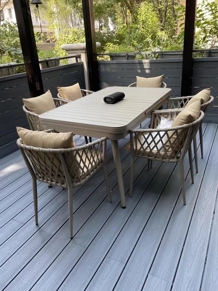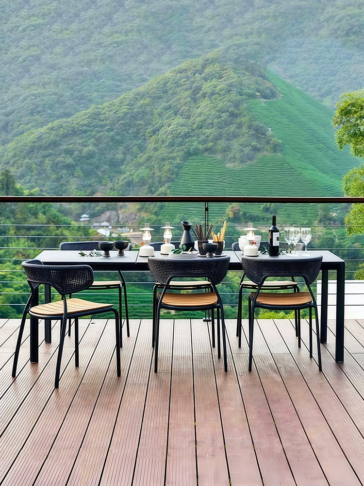 北欧風アウトドアテーブル&チェアセット - ヴィラやバルコニーに最適なラタン椅子付き!おしゃれで広々としたガーデンテーブルで、リラックスした食事のひとときをお楽しみください。