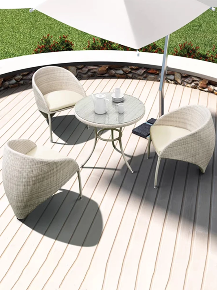 アウトドアデザインの籐編みリラックスチェアセット!北欧スタイルのバルコニー用3点セット、雨にも強い屋外用家具で、心地よい庭やテラスを演出します。おしゃれで機能的な家具で、リラックスしたひとときをお楽しみください。