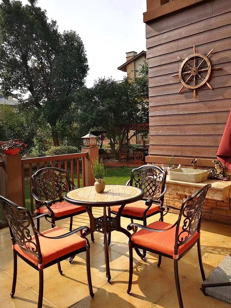 アウトドア別荘庭園用アルミ鋳造テーブル&チェアセット - おしゃれで耐久性抜群!屋外ガーデンやバルコニーにぴったりのヨーロッパスタイルのアイアン家具で、快適なリラックスタイムをお楽しみください。